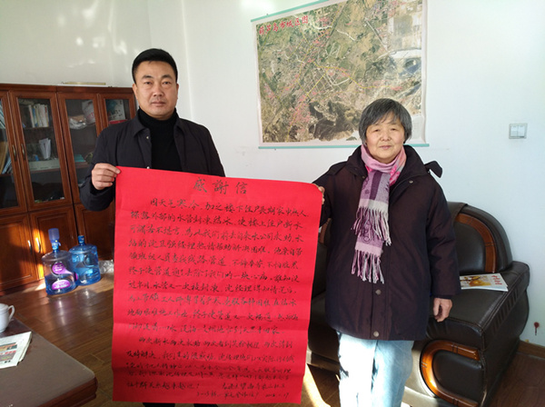 1月30日上午,家住龍港區(qū)望海寺象山社區(qū)3-13棟一單元5樓的一位70多歲的老人在女兒的陪同下,來到自來水公司,專程送來一封熱情洋溢的感謝信,代表全體住戶對自來水公司營業(yè)三分公司維修人員不辭辛苦,兩次及時維修被凍損管線,解決該樓用水問題及熱情周到的服務(wù)表示感謝。