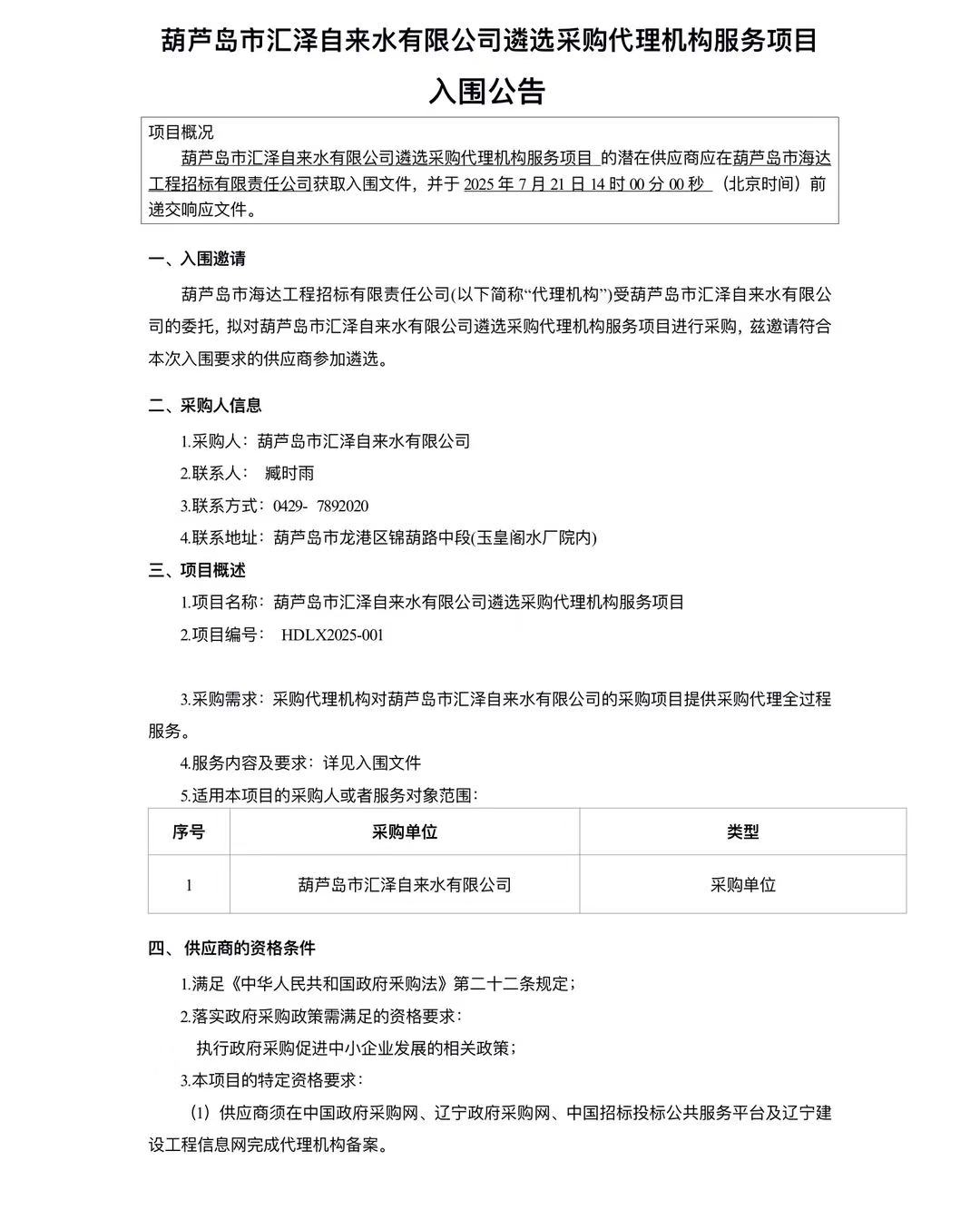 葫蘆島市匯澤自來水有限公司遴選采購代理機(jī)構(gòu)服務(wù)項目 入圍公告