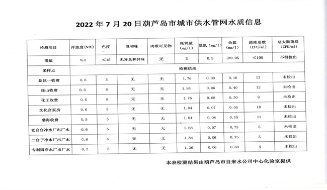 2022年7月20日葫蘆島市城市供水管網(wǎng)水質(zhì)信息