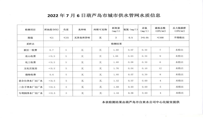 2022年7月6日葫蘆島市城市供水管網(wǎng)水質(zhì)信息