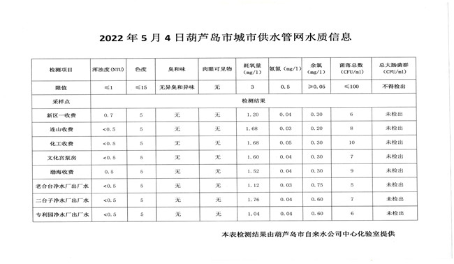 2022年5月4日葫蘆島市城市供水管網水質信息