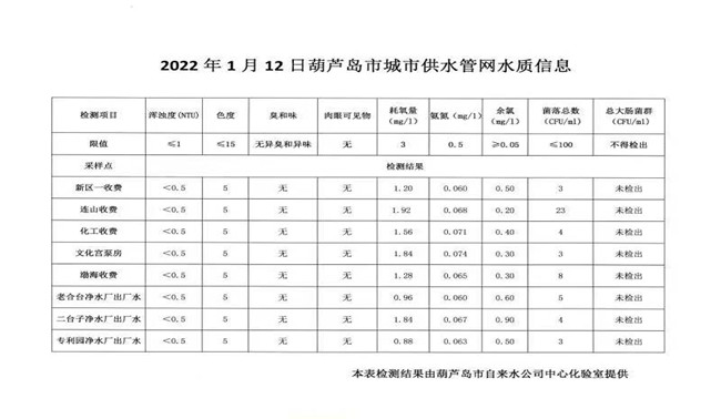 2022年1月12日葫蘆島市城市供水管網(wǎng)水質(zhì)信息
