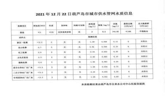 2021年12月22日葫蘆島市城市供水管網水質信息