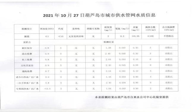 2021年10月27日葫蘆島市城市供水管網(wǎng)水質(zhì)信息