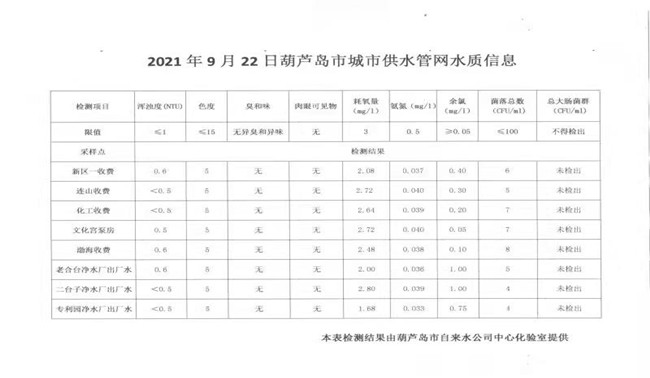 2021年9月22日葫蘆島市城市供水管網(wǎng)水質(zhì)信息
