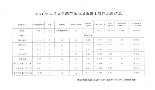 2021年6月2日葫蘆島市城市供水管網(wǎng)水質(zhì)信息