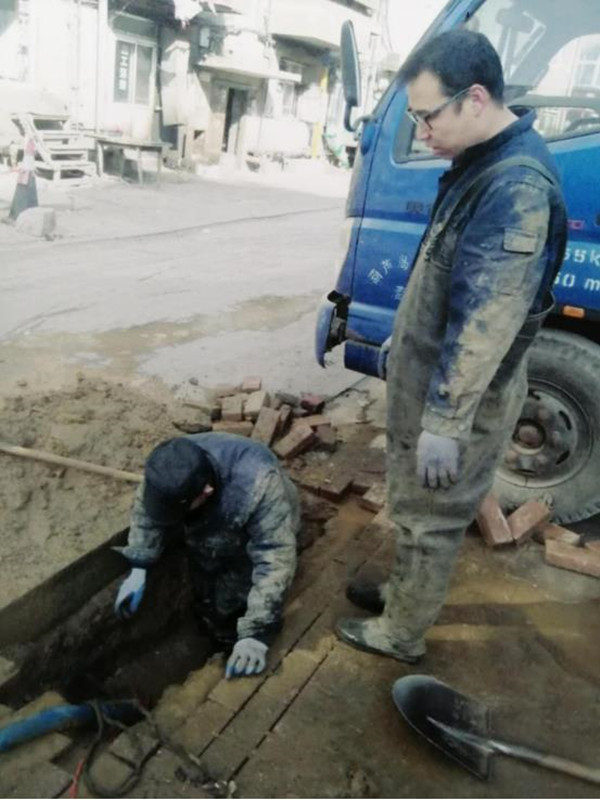 正月初二9:30,營業(yè)第二分公司接到用戶報修電話,反映教育園區(qū)B區(qū)73號樓前供水管線漏水。值班維修人員高峰、張良、張少輝第一時間趕赴現(xiàn)場,當(dāng)即投入到緊張的搶修當(dāng)中。尋找漏點(diǎn)需要破除冰層、挖掘凍土。為了搶時間,他們用鐵鎬、鐵鍬手工輔助除冰、破土。在室外溫度-15℃的工作環(huán)境下,經(jīng)過兩個小時的挖掘,終于找到漏點(diǎn),順利完成維修。