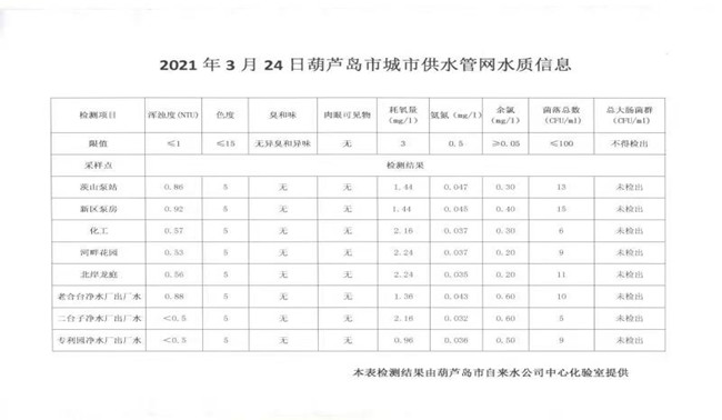 2021年3月24日葫蘆島市城市供水管網(wǎng)水質(zhì)信息