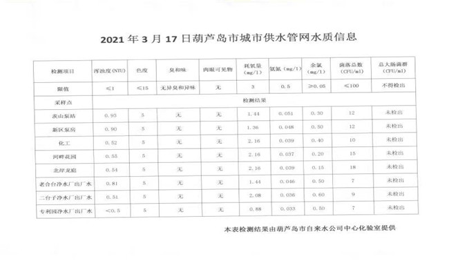 2021年3月17日葫蘆島市城市供水管網(wǎng)水質(zhì)信息