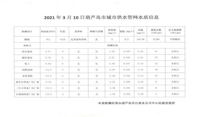 2021年3月10日葫蘆島市城市供水管網(wǎng)水質(zhì)信息