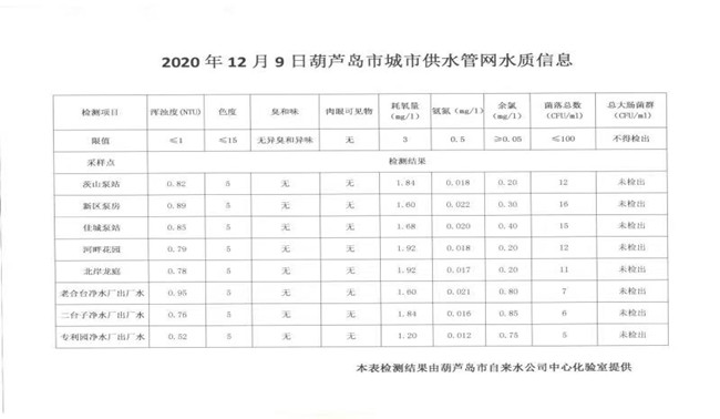 2020年12月9日葫蘆島市城市供水管網(wǎng)水質信息