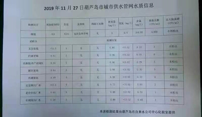 2019年11月27日葫蘆島市城市供水管網(wǎng)水質(zhì)信息