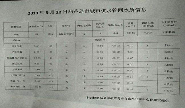 2019年3月20日葫蘆島市城市供水管網(wǎng)水質(zhì)信息
