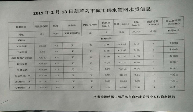 2019年2月13日葫蘆島市城市供水管網(wǎng)水質(zhì)信息