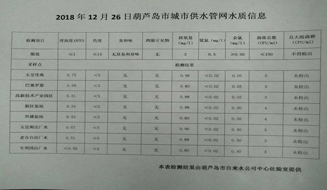 2018年12月26日葫蘆島市城市供水管網(wǎng)水質(zhì)信息