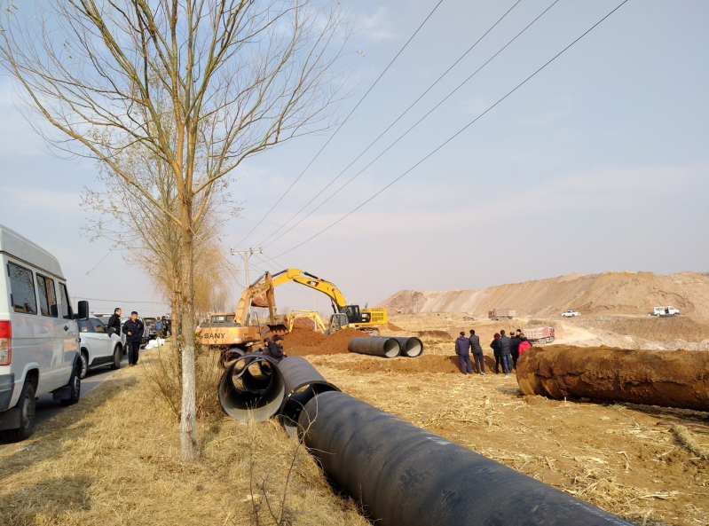 當天下午4時,市自來水工程總公司抽調(diào)的35名搶修精干力量投入搶修作業(yè),同時出動大型挖掘機3臺,搶修設備包括大小發(fā)電機組7臺,水泵3臺,電焊機6臺。搶修難度遠比預想的要困難得多。地下管線十分復雜,破損點位排查困難,實施停水作業(yè)后,最終確定破損位置,因次生土壤塌方將200余延長米管線壓斷,并且破口較大,經(jīng)現(xiàn)場有關技術(shù)人員一致研究決定采取徹底換管的方案。由于受損管線長達200余米,并且管徑大,原材料庫存少,公司材料處當場聯(lián)系,緊急調(diào)動新管線。搶修過程中,需要穿越鋅廠位于地下2.2米深的DN800供水管線,使新的輸水管線需要深挖至6米深的地下實施安裝。并且安裝的管邊離1萬伏的電纜不到1米遠,十分危險,為保障安全,施工中先用吊車、挖掘機扶住電線桿子后再作業(yè)。初冬的11月份,深夜氣溫驟降。搶修人員冒著零下十幾度的嚴寒,輪流吃飯,舍不得片刻休息,搶時間、爭速度。