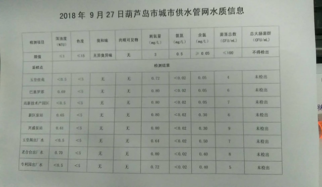 2018年9月27日葫蘆島市城市供水管網(wǎng)水質信息