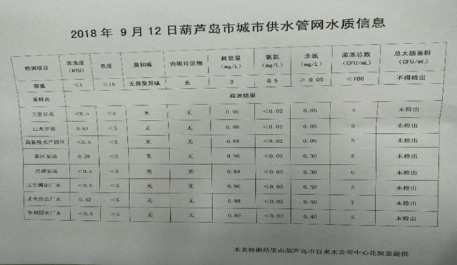 2018年9月12日葫蘆島市城市供水管網(wǎng)水質(zhì)信息