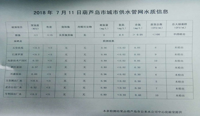 2018年7月11日葫蘆島市城市供水管網(wǎng)水質(zhì)信息