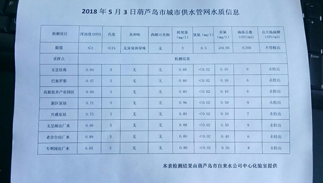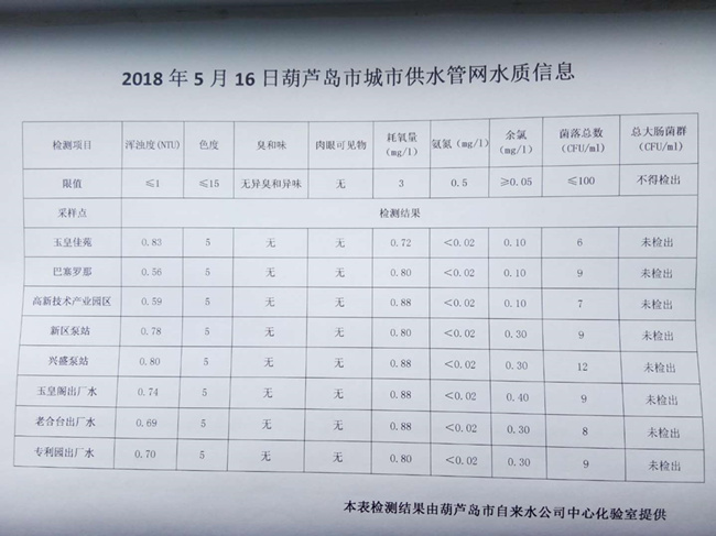 2018年5月3日 9日 16日 葫蘆島市城市供水管網(wǎng)水質(zhì)信息