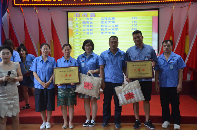 此次競(jìng)賽內(nèi)容包括《黨章》、《廉政準(zhǔn)則》、《習(xí)近平系列重要講話》等知識(shí),公司5個(gè)黨支部集體參加比賽,經(jīng)過緊張激烈而精彩的角逐,工程公司支部獲得一等獎(jiǎng),機(jī)關(guān)二支部、營業(yè)支部獲得二等獎(jiǎng),機(jī)關(guān)一支部、生產(chǎn)支部獲得三等獎(jiǎng)。