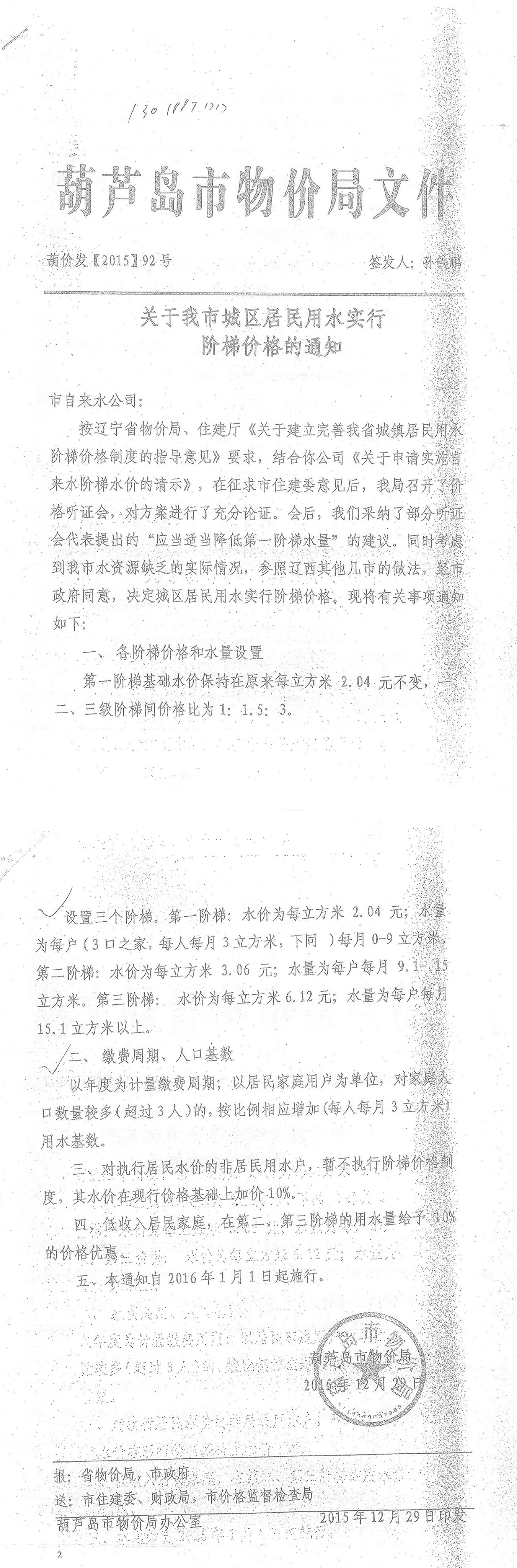 2001年水價調(diào)整后,居民1.7元/噸,工業(yè)2.5元/噸,商業(yè)5.5元/噸,特業(yè)10元/噸;